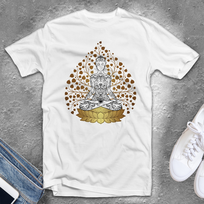 Με τη φιγούρα σε στάση διαλογισμού και ήρεμο σχέδιο, το μπλουζάκι αυτό ενσωματώνει την αίσθηση γαλήνης στην καθημερινότητά σας.