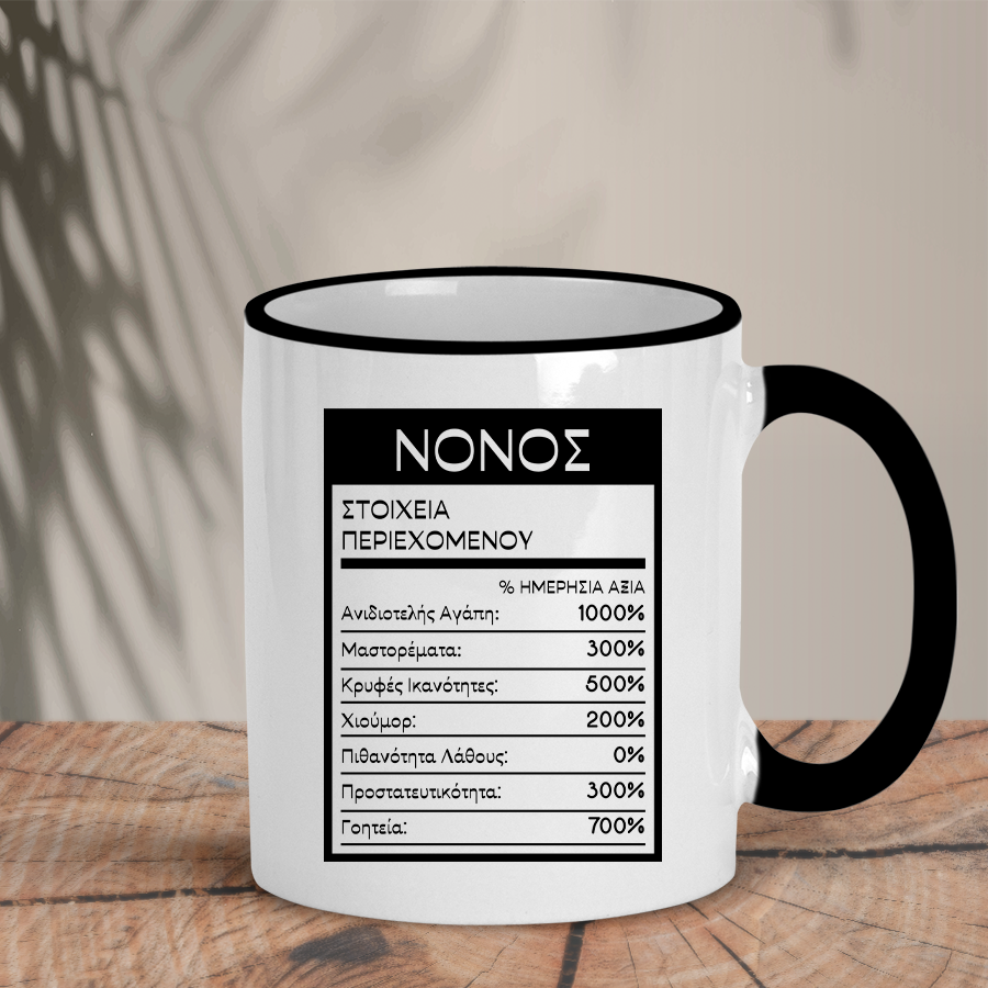 Χαρίστε στον νονό σας την δίχρωμη κούπα “Νονός – Στοιχεία Περιεχομένου”, με ένα χιουμοριστικό σχέδιο που αποκαλύπτει τα “συστατικά” που τον κάνουν μοναδικό.