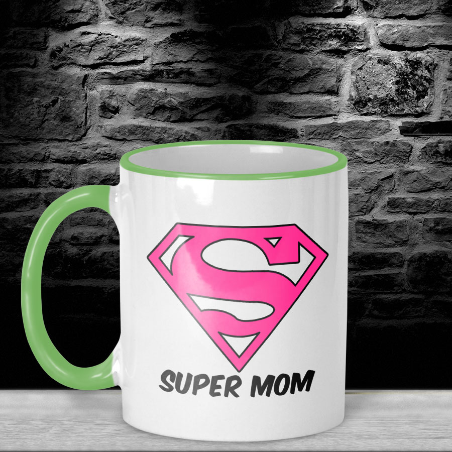Κομψή δίχρωμη κούπα με το σχέδιο “Super Mom”, ιδανική για τη μαμά που ξεχωρίζει κάθε μέρα.