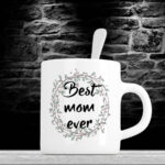 Κομψή λευκή κούπα με το σχέδιο “Best Mom Ever”, που εκφράζει τη φροντίδα και την αγάπη της μαμάς.