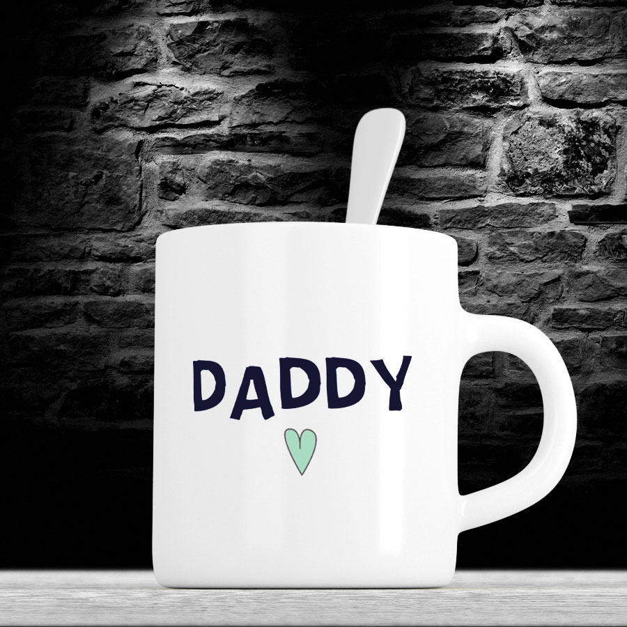 Λευκή κούπα με το σχέδιο “Daddy” και μια γλυκιά καρδιά, ιδανική για τον μπαμπά που αγαπά τον καφέ του.