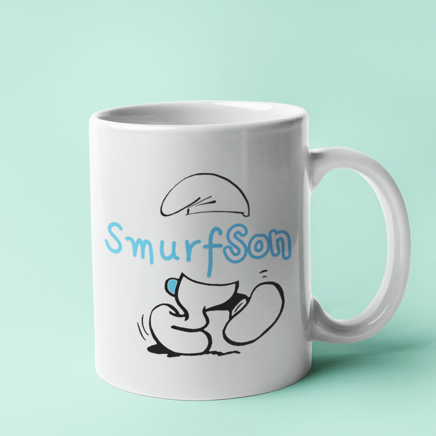 Λευκή κούπα με το σχέδιο “Smurfson”, τέλεια για τον μικρό σας ήρωα.