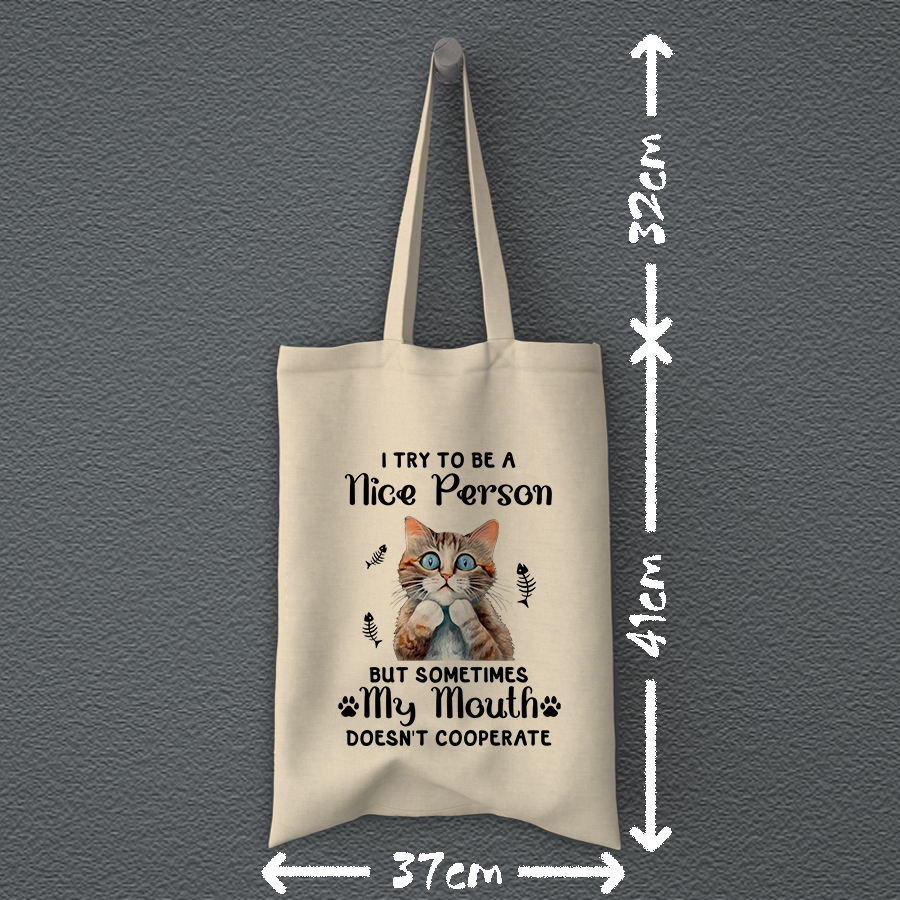Η Οικολογική Υφασμάτινη Τσάντα | I try to be a nice person but sometimes my mouth doesn’t cooperate είναι η τέλεια προσθήκη για όσους έχουν ειλικρινή γλώσσα… και αστείρευτο χιούμορ!