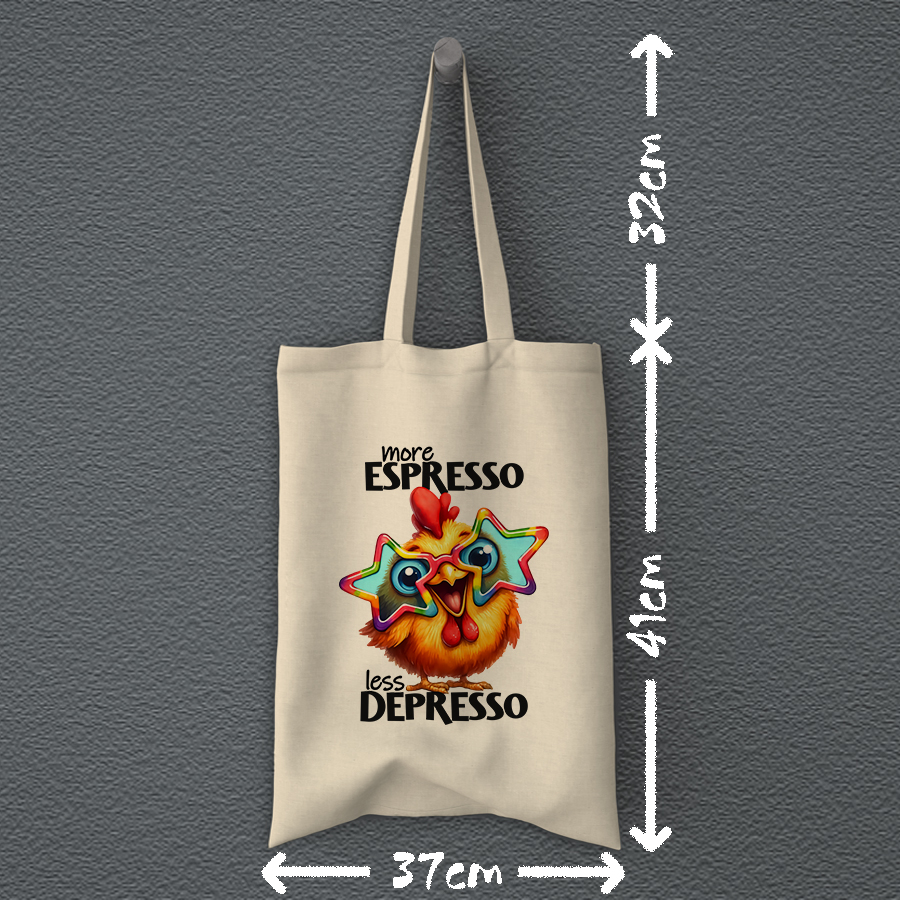 Η Οικολογική Υφασμάτινη Τσάντα | More espresso Less depresso είναι η τέλεια επιλογή για όσους γνωρίζουν ότι μια καλή δόση espresso μπορεί να διώξει κάθε θλίψη και να φέρει θετική διάθεση!