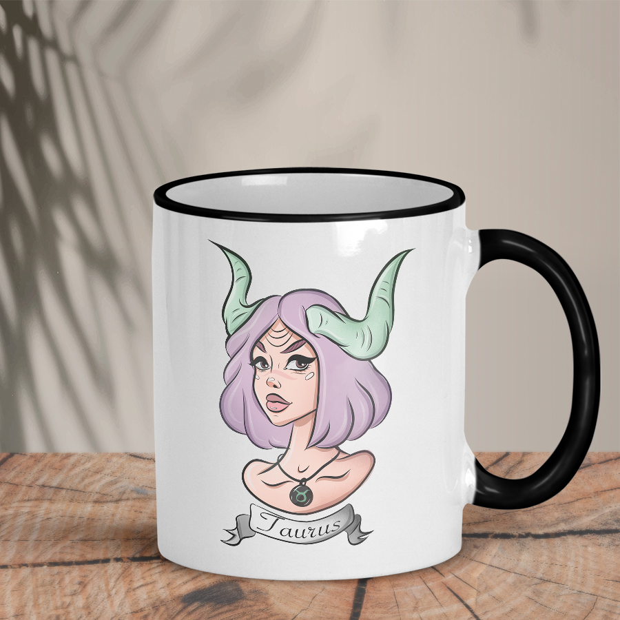 Το ζώδιο του Ταύρου ζωντανεύει με ένα εντυπωσιακό σχέδιο γυναίκας με λιλά μαλλιά και πράσινα κέρατα, σε μια κεραμική δίχρωμη κούπα που συνδυάζει στυλ και ποιότητα.
