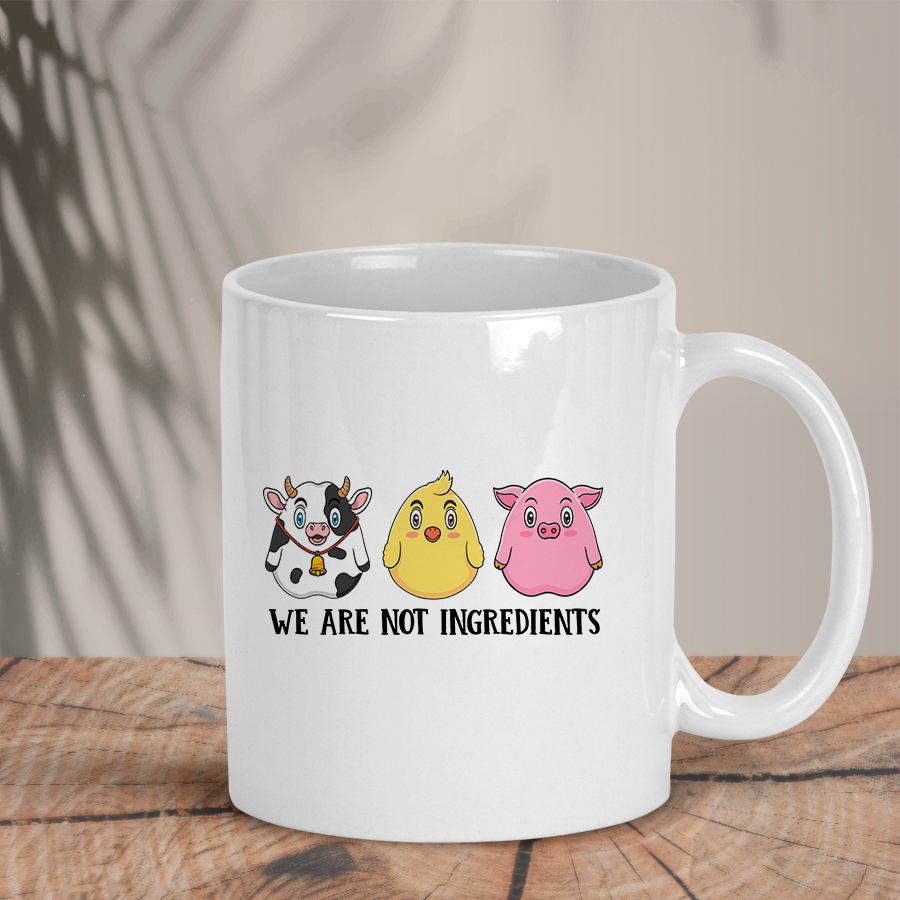 Η λευκή κούπα “We Are Not Ingredients” συνδυάζει χαριτωμένο design με ξεκάθαρο μήνυμα υπέρ των ζώων.
