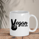 Η λευκή κούπα “Vegan for Life” συνδυάζει minimal γραφιστική (peace-hand που σχηματίζει το V) με sublimation υψηλής ανάλυσης, ώστε το μαύρο print να παραμένει καθαρό και έντονο στην καθημερινή χρήση.