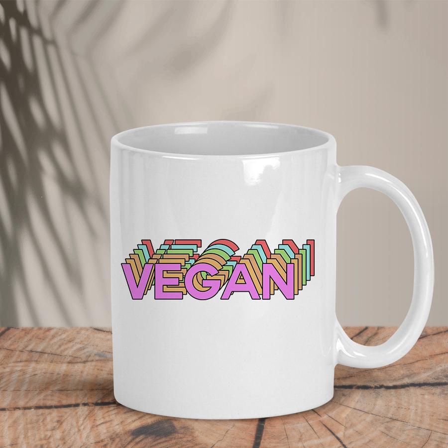 Η λευκή κούπα “Vegan 3D” τυπώνεται με sublimation υψηλής ανάλυσης ώστε τα παστέλ layers (ροζ, μέντα, πορτοκαλί, τιρκουάζ) να δείχνουν καθαρά, ζωντανά και να αντέχουν στην καθημερινή χρήση.